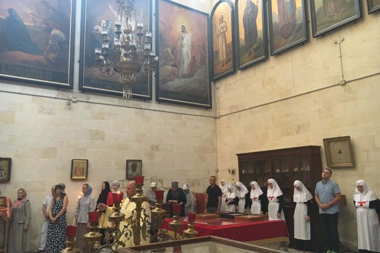 98-я годовщина трагедии. Возложение цветов в Гефсимании 17 июля 2016 года, сестры Иерусалимского Свято-Елисаветинского сестричества милосердия и сотрудники Александровского подворья возложили в храме Марии Магдалины в Гефсимании композиционный букет на раку св. Великой Княгини Елисаветы Феодоровны